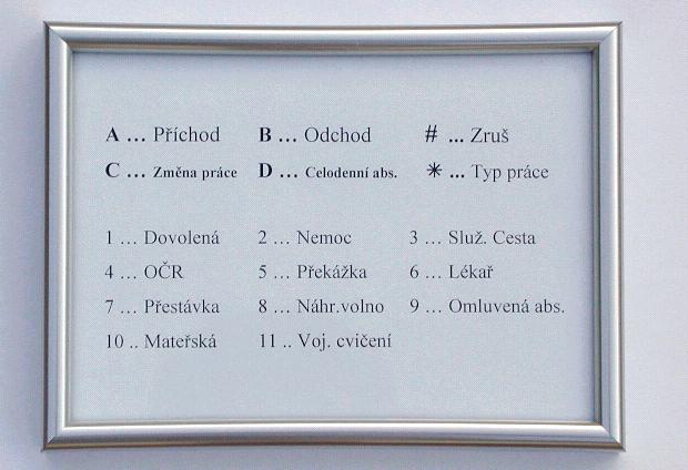 systému - příchody, odchody, 20 kódů přerušení a celodenních absencí, typy práce atd.